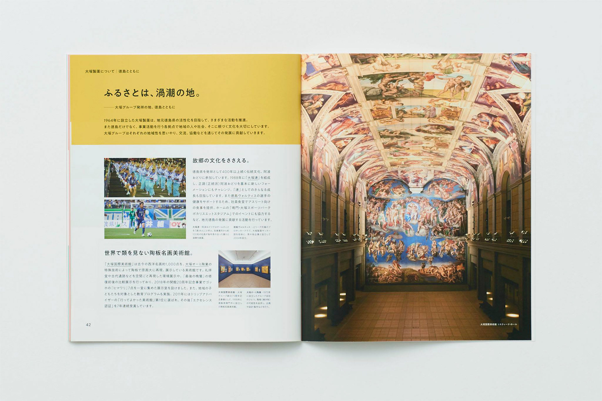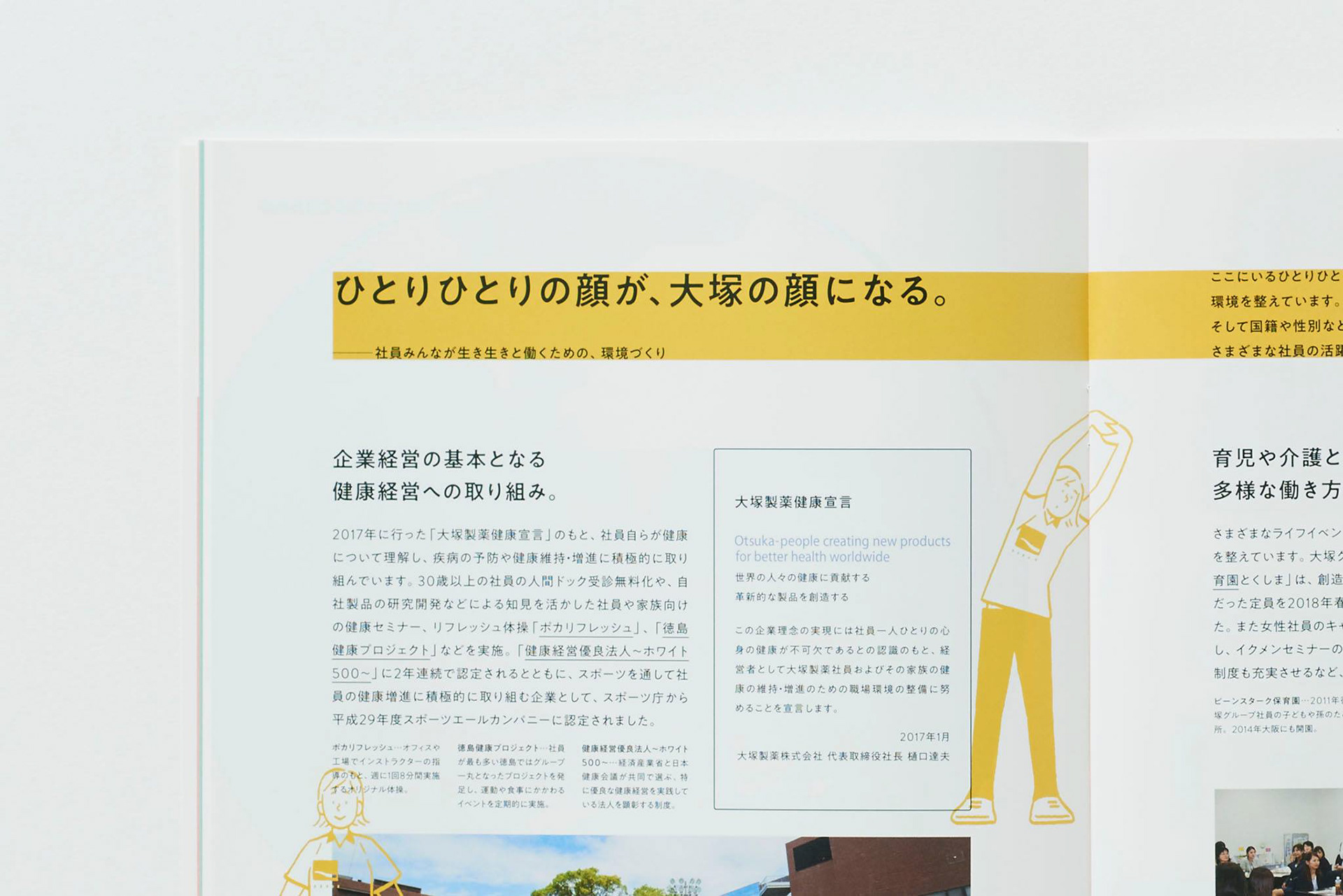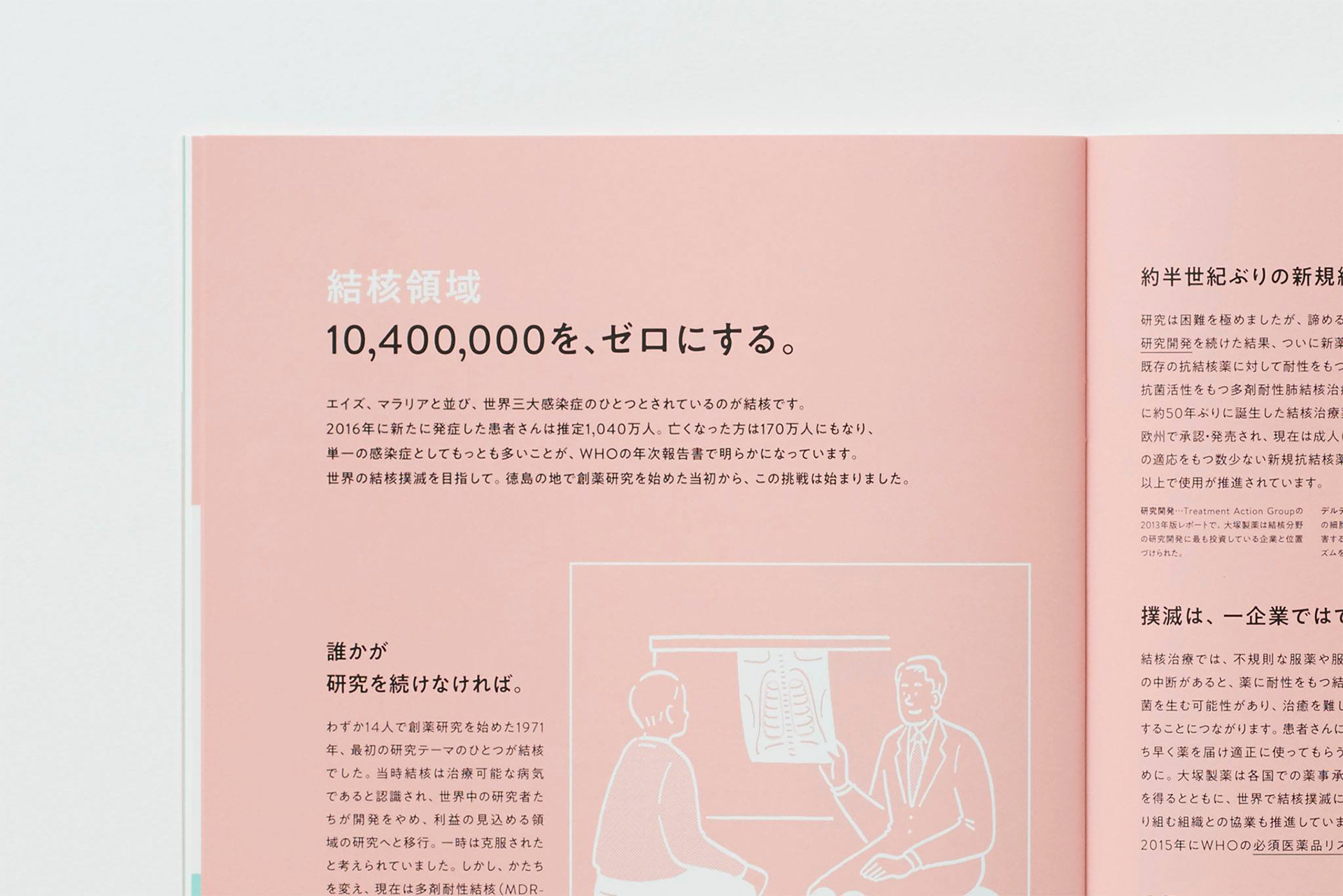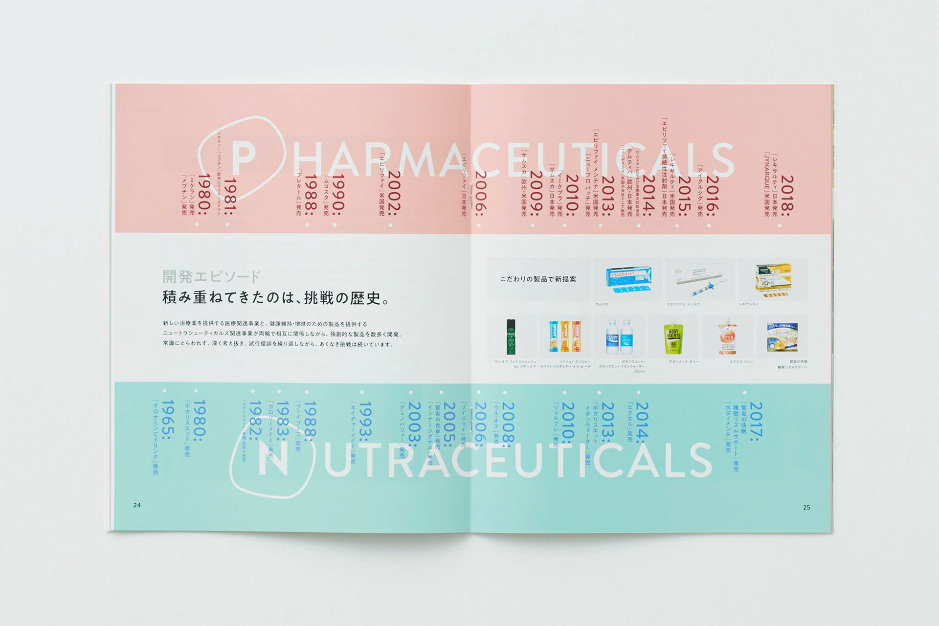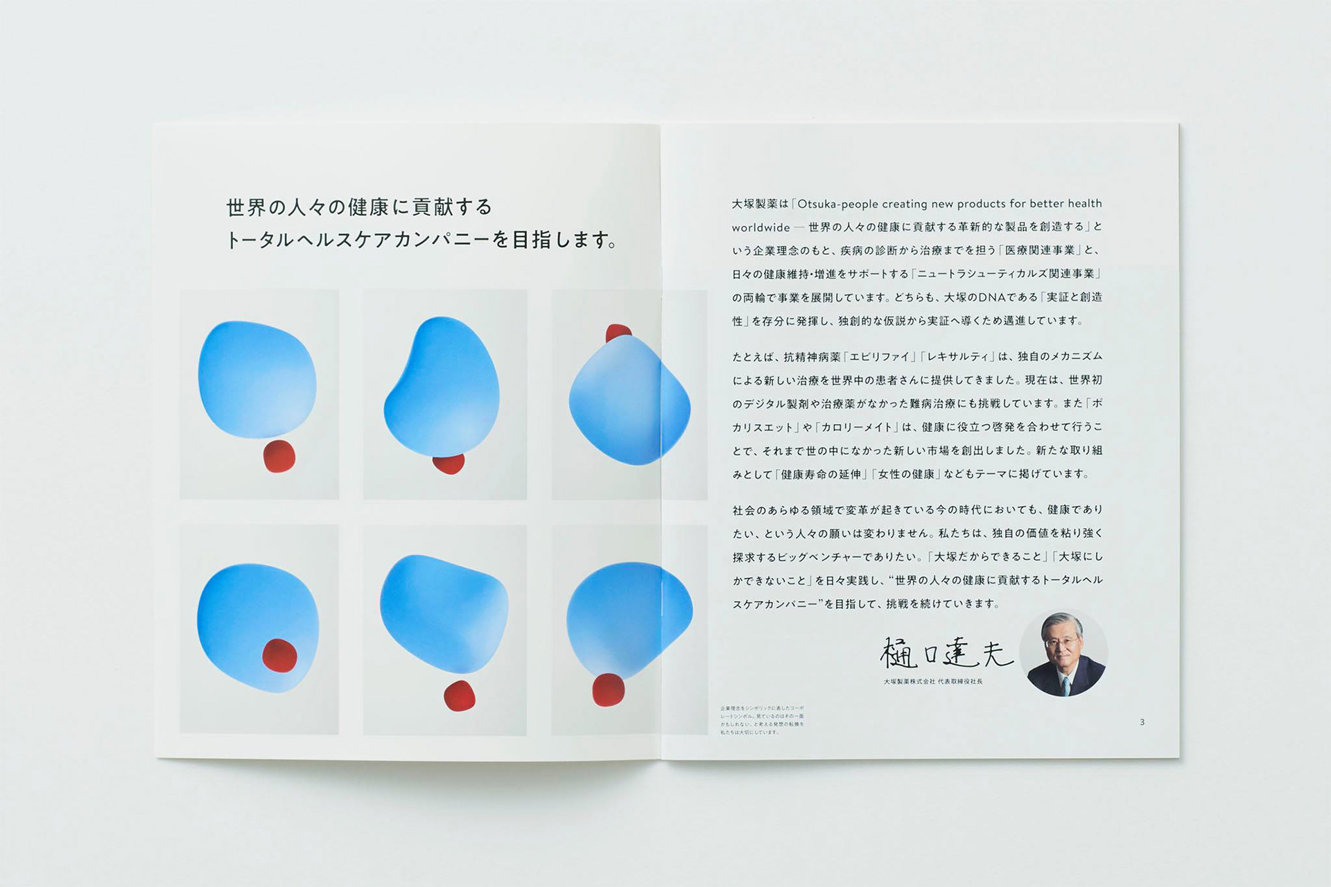 ポカリスエット、カロリーメイトなどでおなじみの大塚製薬の会社案内をアートディレクション・デザインしました。通常平面で記されるロゴに、奥行きをあたえて立体化したオブジェを制作。これをさまざまな角度から撮影し、表紙や巻頭ページに使用することで大塚製薬の多角的な発想姿勢を表現しました。お取引先やリクルート、社内へと広範囲に使用されることを考えて、難しい医薬品の話もわかりやすく解説しています。