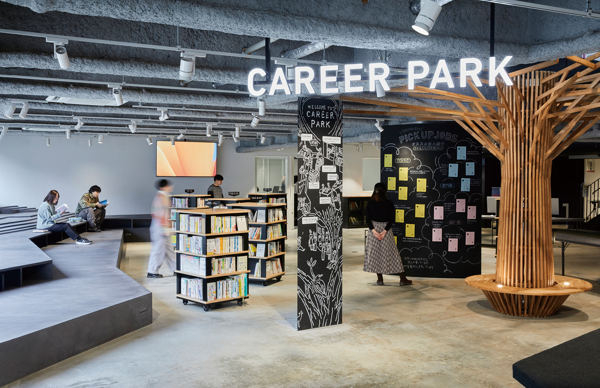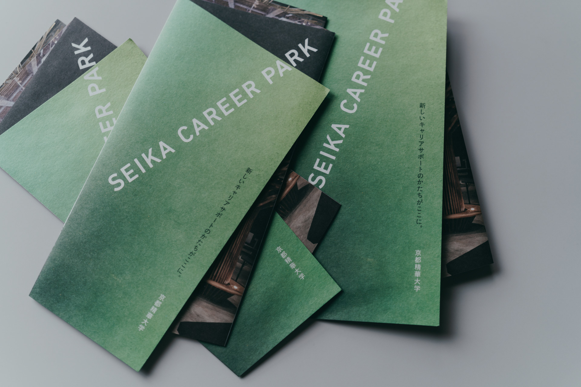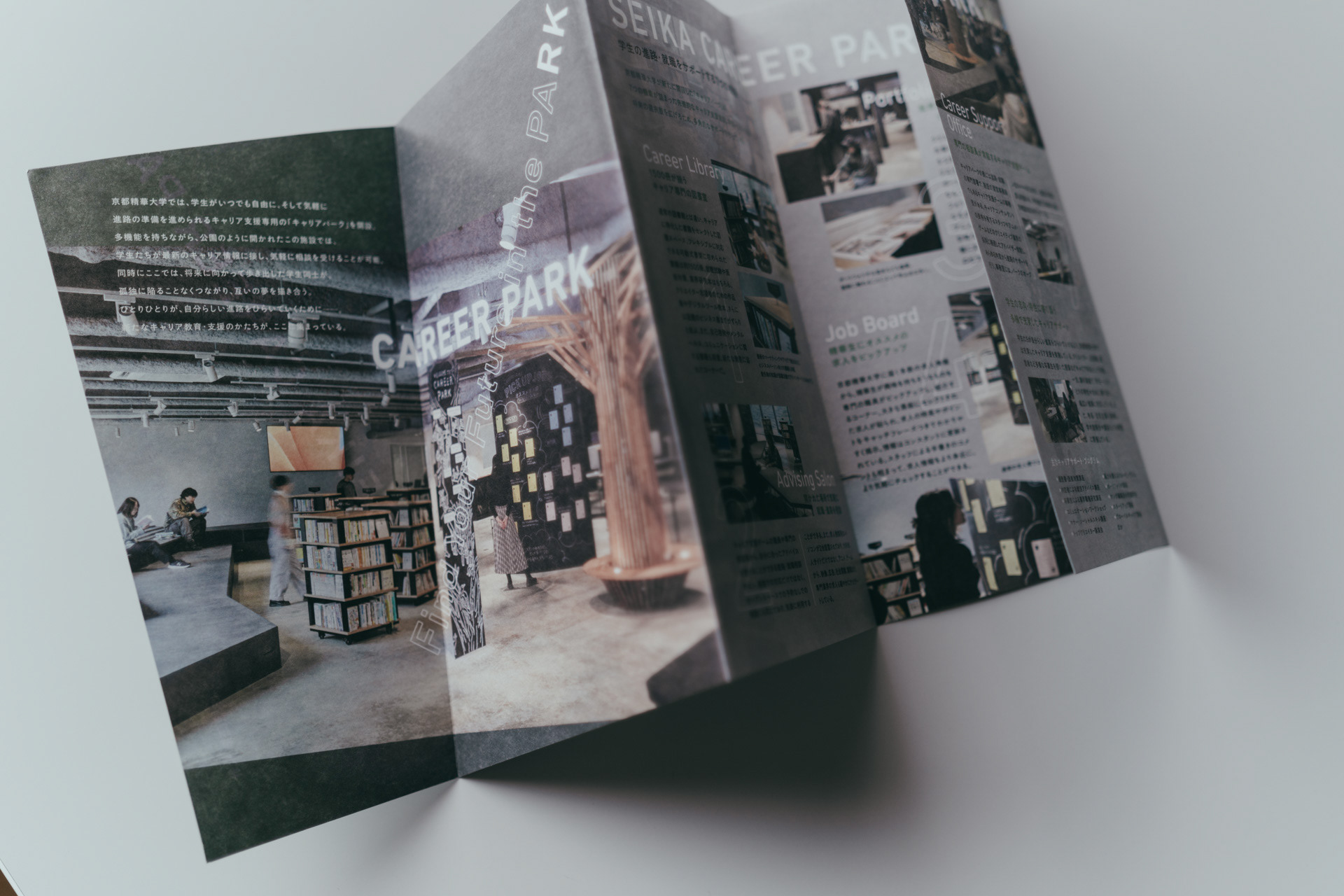 京都精華大学のキャリア支援拠点「キャリアパーク」のサインデザインや家具デザインを担当しました。10年来のゲスト講義でお世話になっている大学だけに、思い入れも一入。既存スペースのモチーフを活かしつつ、公園というテーマで拡張発展させることで、フロア全体との調和を図りました。 サインは判読性の高いシンプルな書体を使用し、時代に流されない佇まいを追求。コンスタントなイベント開催や関連書籍への学生の関心向上など、嬉しい反響をいただいています。