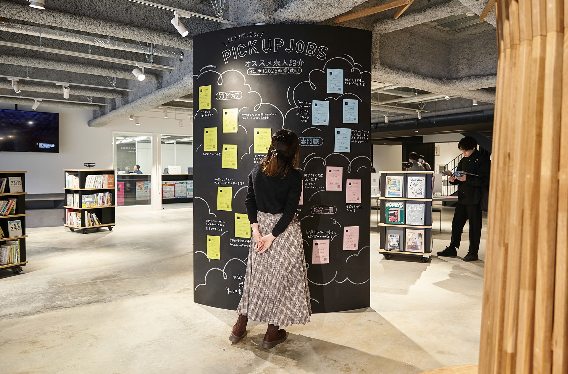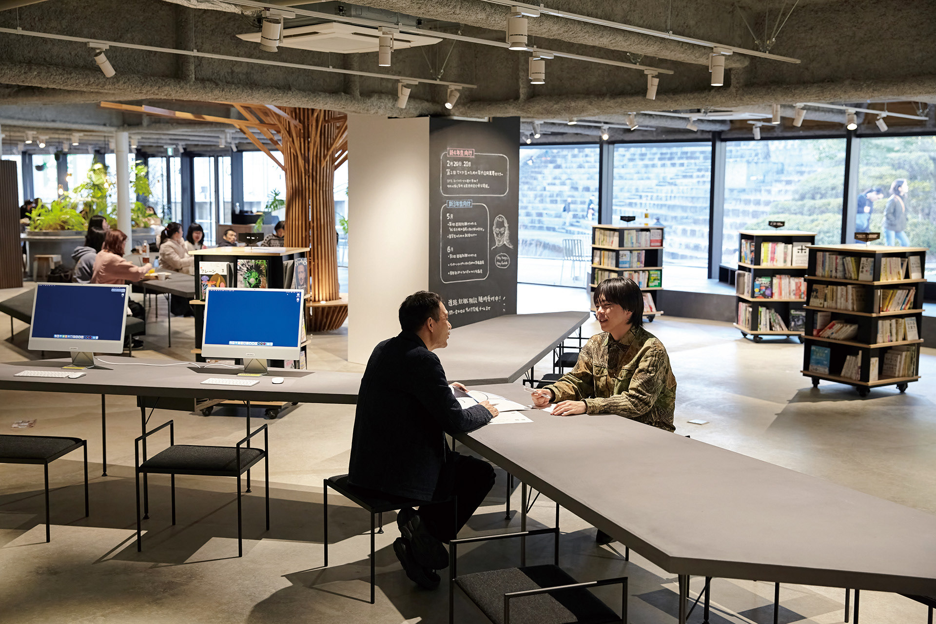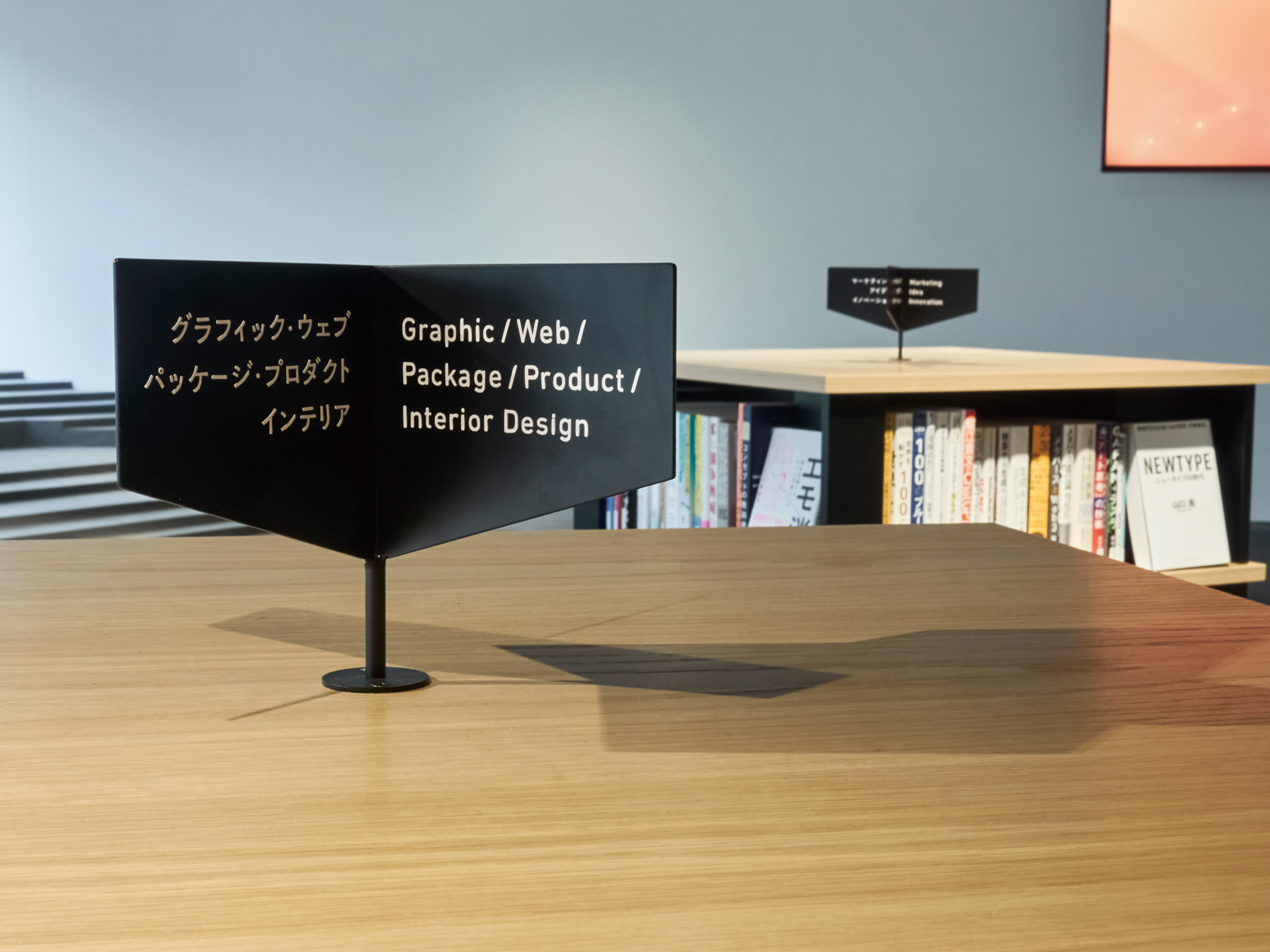 京都精華大学のキャリア支援拠点「キャリアパーク」のサインデザインや家具デザインを担当しました。10年来のゲスト講義でお世話になっている大学だけに、思い入れも一入。既存スペースのモチーフを活かしつつ、公園というテーマで拡張発展させることで、フロア全体との調和を図りました。 サインは判読性の高いシンプルな書体を使用し、時代に流されない佇まいを追求。コンスタントなイベント開催や関連書籍への学生の関心向上など、嬉しい反響をいただいています。